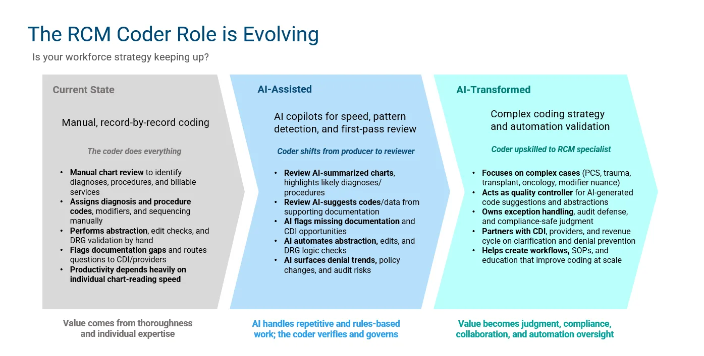 And then, in the AI-transformed model, the coder becomes the person who handles complex cases, controls quality, manages exceptions, supports audit defense, and helps build the workflows that let the system scale.